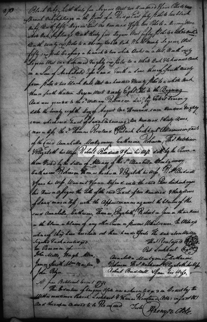 [6] See also “Birdwell Family” in The Fincastle [Virginia] Herald (10 July 1997), p. 3-B, which says that Robert Birdwell bought 244 acres from George Rowland on the west side of the James River in 1775. In 1782, he sold the land to Robert Harris. This article states that Robert married Jane, heir to William Robinson, whose sister married Thomas Hutchison.