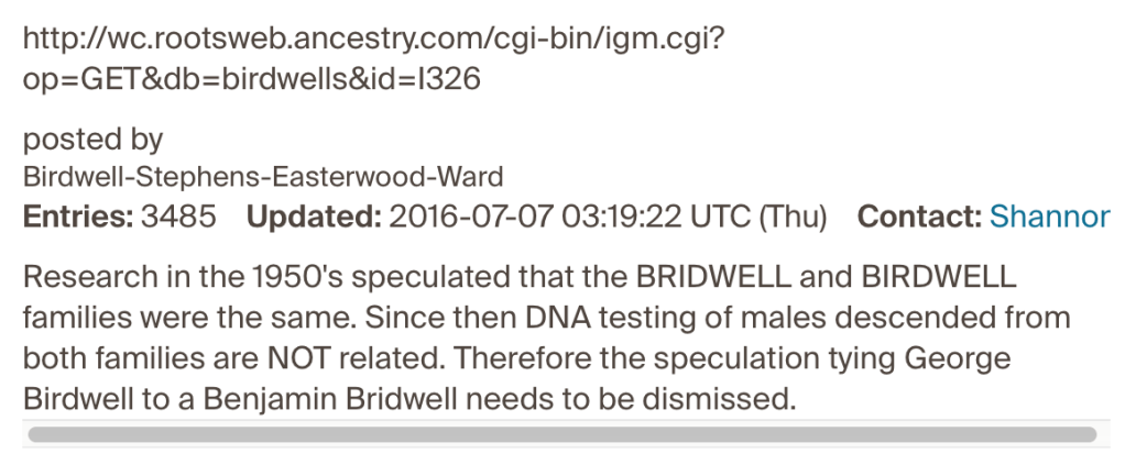One thought on “The Claim that George Birdwell (bef. 1725-1781) Was a Bridwell from Stafford County, Virginia: DNA Evidence?”