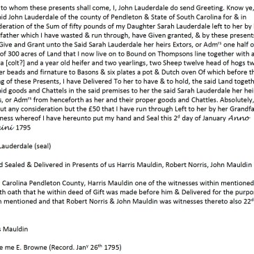 Or, Subtitled: “In consideration of the Sum of fifty pounds of my Daughter Sarah Lauderdale left to her by her grandfather which I have wasted & run through” As I’ll be telling you in more detail in a day or so, I’m now going to launch a series of postings about my Lauderdale family line, … More A New Series of Postings Focusing on a Lauderdale Family of the U.S. South