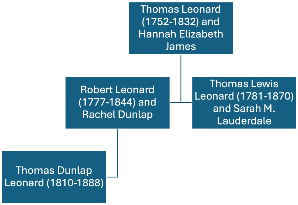 Thomas Lewis Leonard, Robert Leonard, and Hannah Leonard Moore were children of Thomas Leonard (1752-1832) and Hannah Elizabeth James, who moved from Pendleton County, South Carolina, to Tennessee in 1806, settling in Bedford County, which became Lincoln County in 1809 — with the Leonards’ land falling into Marshall County at that county’s formation in 1836. Thomas Dunlap Leonard grew up in Tennessee knowing his grandparents Thomas and Hannah Leonard and gathering information about the history of the Leonard family from them and other Leonard relatives living near Petersburg, Tennessee. About 1818, Robert Leonard moved his family to Madison County, Alabama, and Thomas Dunlap Leonard continued his interaction with Leonard relatives in north Alabama and back in Tennessee after that move.