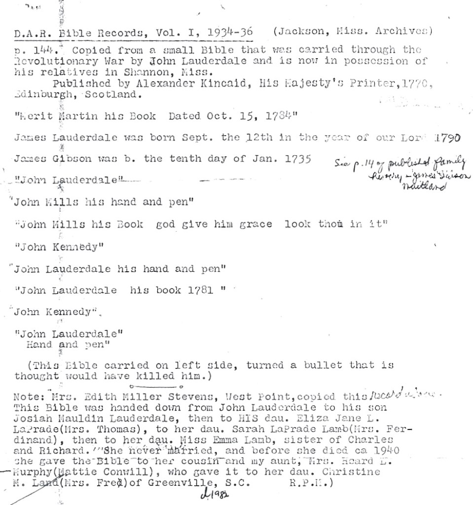I assume that this header indicates that the information about John Lauderdale’s bible which follows appeared in a volume of DAR bible records published in 1934-6, probably by a Mississippi DAR chapter. This publication may, in fact, be a volume of bible records that appears in the catalogue of the DAR library under the title Mississippi DAR GRC report; s1 v012: bible records and a few prerequisite items [bk. 1] (Mississippi DAR, G.R.C., 1934-6). I have not seen this publication.