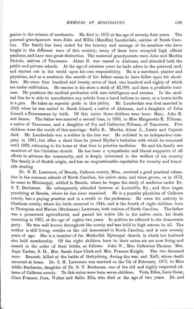 [3] This date of birth is recorded on the tombstone of John G. Lauderdale in Bakers Chapel cemetery, Hernando, DeSoto County, Mississippi: see the Find a Grave memorial page for John Gammel Lauderdale, created by Rachelle Ashmore Sanders, with a tombstone photo by Sanders. See also an affidavit given on 27 September 1962 by Mattie Conwill Murphy before the chancery clerk of Clay County, Mississippi, which states that this birthdate of John Gammel Lauderdale, his parents’ names, and other family information had been given to her in writing on 9 August 1943 by Ms. Winnie H. Gartrell of Hernando, Mississippi, and on 17 February 1949 by Ms. Martha Lauderdale Lusher of Nesbitt, Mississippi. I’m not certain of the source of my copy of this affidavit, which is a typescript sent to me in May 1997 by Imogen Turman of Jackson, Mississippi, and also in April 1997 by Penny Culver of West Helena, Arkansas. The affidavit appears to have been given as part of an application for DAR membership. Finally, a biography of Abner Driver Lauderdale, son of John Gammel Lauderdale and Penelope Nichols, states that Abner’s father John G. Lauderdale, son of John and Millie Maudlin [sic] Lauderdale, natives of South Carolina, died in Limestone County, Alabama in 1872, aged seventy-four years: see Biographical and Historical Memoirs of Mississippi, etc., vol. 1 (Chicago: Goodspeed, 1891), pp. 1102-3.