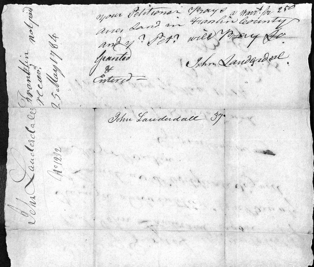 In a document she wrote in 1996 entitled “John Lauderdale, ‘Refugee Soldier,’ American Revolution,” Eugenia Messick notes that when John Lauderdale petitioned for bounty land in Franklin County, Georgia, on 25 May 1784, signing his name as John Lauderdal, the official who filed the petition wrote John’s name again under his signature (spelling the surname Lauderdall), following the name with the number 37.[5] Eugenia Messick suggests that this was John’s age in 1784. If this suggestion is correct, then John may have been born in 1747. In History of the Lauderdales in America, Clint A. Lauderdale accepts this suggestion and makes 1747 John’s year of birth.[6]