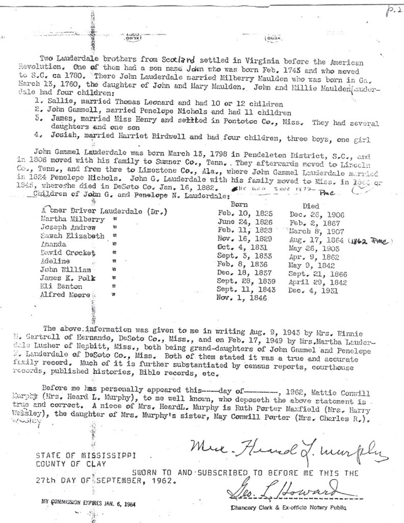 Now for some specific information about the date of birth of the John Lauderdale found in Pendleton County, South Carolina, and Georgia records in the 1780s and 1790s: in an affidavit she gave on 27 September 1962 before the chancery clerk of Clay County, Mississippi, Mattie Conwill Murphy, a descendant of John Lauderdale, stated that John Lauderdale was born in Virginia in February 1745. The affidavit also says that this information and other pieces of family history stated in the affidavit had been given to Murphy in writing on 9 August 1943 and 17 February 1949 by two other descendants of John Lauderdale, Winnie H. Gartrell of Hernando, Mississippi, and Martha Lauderdale Lusher of Nesbit, Mississippi. As I noted above when I cited this material previously (see n. 3), a typescript copy of this affidavit sent to me by researchers Imogen Turman and Penny Culver does not indicate the source of the typescript. The affidavit appears to me to have been made as part of an application for DAR membership.