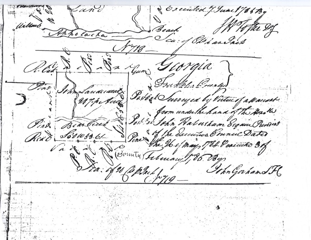 John Lauderdale’s bounty-land claim was honored and he did receive a land grant in Franklin County, Georgia. On 26 May 1784, a warrant for a survey of 287½ acres of bounty land for him was issued, and on 3 February 1785, the land, which was on Bear Creek in Franklin County, was surveyed. On 12 October 1785 the land grant was made.