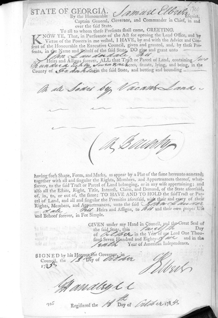 [2] 25 May 1784 petition of John Lauderdall for bounty land, Franklin County, Georgia, for service as a “Refugee soldier,” John Lauderdale loose-plats file, Georgia Surveyor General Department.