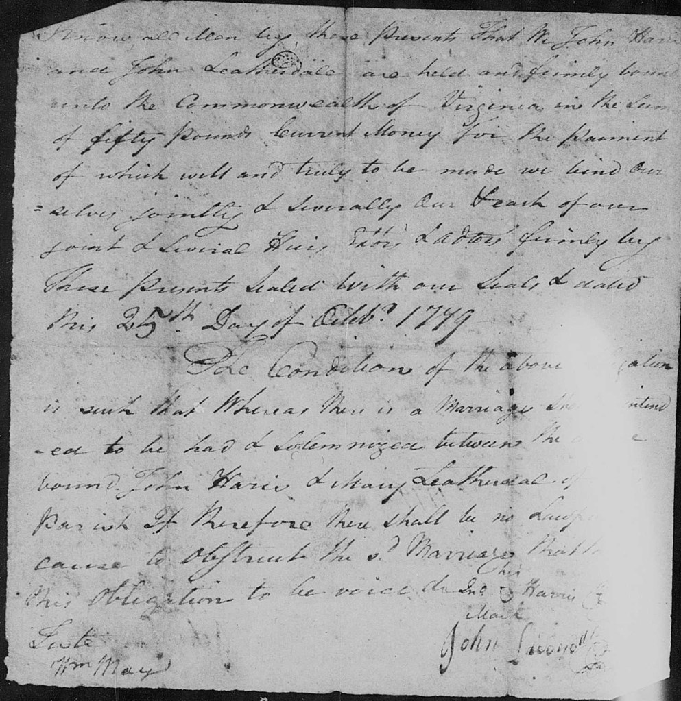 Clint Lauderdale proposes that this March 1771 receipt was signed by John Lauderdale son of James Sr., but that is not correct.[7] But the signature of the John signing the 1771 receipt — he signs as John Lauderdeal — does not match the signature of John Lauderdale on his May 1784 petition for bounty land in Georgia. The same John Lauderdeal signed a bond on 25 October 1779 in Botetourt County for John Harris’ marriage to his daughter Mary. The bond spells John and Mary’s surname as Leatherdale, but John signed as Lauderdeal. The signature on the bond matches the signature on the 1771 receipt to Preston.[8]