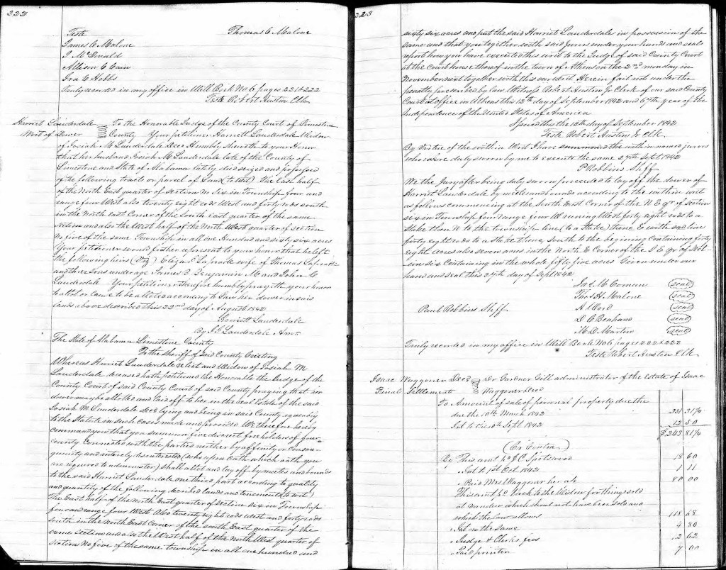 On 22 August 1842, Josiah’s widow Harriet Birdwell Lauderdale petitioned for her share of her husband’s land, which included 166 acres in sections 5 and 6, township 4, range 4 west in Limestone County.[22] Harriet’s appeal for dower states that Josiah left children Elizabeth, wife of Thomas Laprade, and three minor sons, James B., Benjamin M. , and John C. Harriet was allotted a dower share of 55 acres.