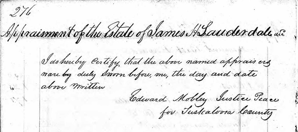After appearing on the 1840 federal census in Tuscaloosa County,[8] James Henry Lauderdale died prior to 12 November 1840, when his widow Sarah was granted administration of his estate with John L.S. Foster as co-administrator and with Hardy Foster and Willis Willingham giving bond.[9] A court order for the appraisement of the estate was given on 1 December 1840, and on that date, Hardy Foster, Willis Willingham, Charles S. Bealle, and David G. Jones appraised the estate and returned the appraisement to court.[10]