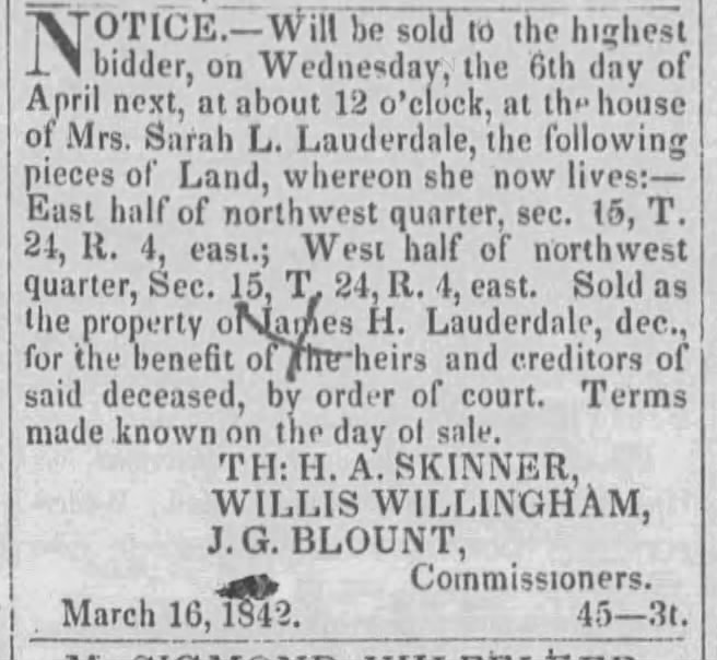[13] On 16 March 1842, Tuscaloosa’s Independent Monitor published a notice (p. 3, col. 3) that on 6 April land formerly belonging to James H. Lauderdale would be sold at the house of Sarah L. Lauderdale, who lived on the land: the east ½ of northwest ¼, section 16, township 21, range 4 east and the west ½ of northwest ¼, section 15, township 24, range 4 east.
