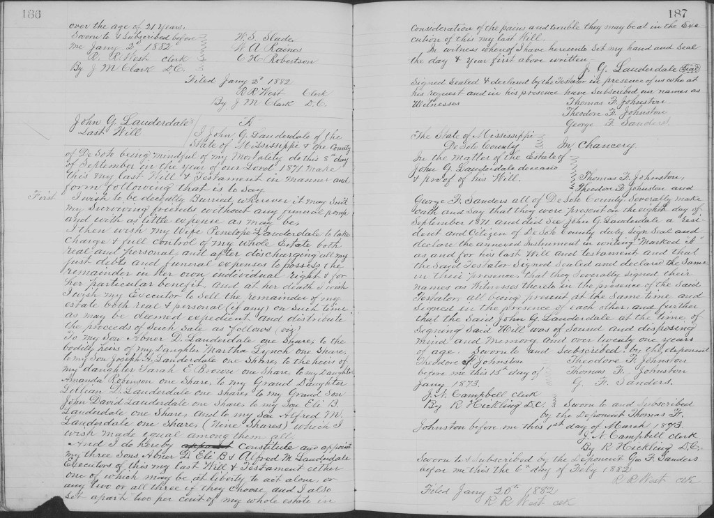 John Gammel Lauderdale died testate near Hernando, the county seat of DeSoto County, Mississippi, on 8 August 1872. His tombstone in Bakers Chapel cemetery at Hernando, which was erected by his son Eli Benton Lauderdale, incorrectly gives the year of death as 1873.[31] John’s will is dated 8 September 1871, and was probated 15 January 1873.[32] The will leaves John’s estate in the hands of his widow Penelope up to the time of her death, and names John’s children Abner D., Martha (Lynch), Joseph A., Sarah E. (Brown), Amanda (Robinson), Eli B., and Alfred M. Lauderdale. The will also makes a bequest to the children of John’s deceased son David Crockett Lauderdale, Lillian D. and John David Lauderdale. John made his three living sons his executors, and signed his will John G. Lauderdale with witnesses Thomas F. Johnston, Theodore F. Johnston, and George F. Sanders.