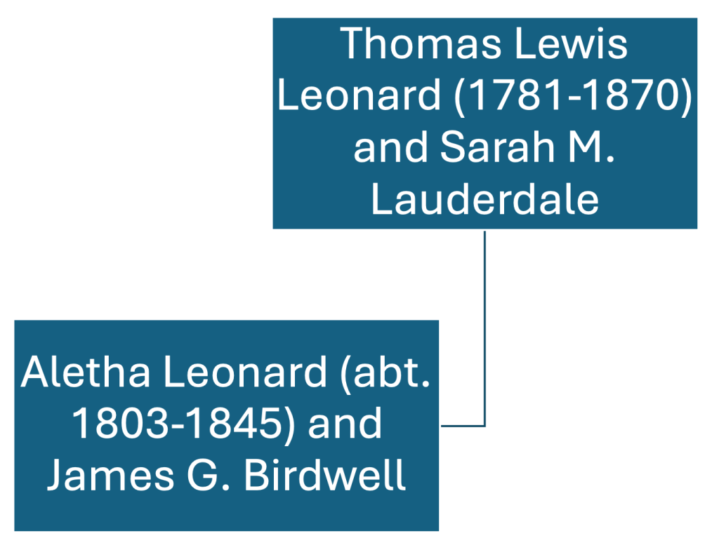1. Sarah M. Lauderdale, whose full name was likely Sarah Mauldin Lauderdale, was born about 1785 in Wilkes County, Georgia. About 1800 in Pendleton District, South Carolina, Sarah married Thomas Lewis Leonard, son of Thomas Leonard and Hannah Elizabeth James. Sarah died before 1870 (about 1866, according to some undocumented sources) near Alto in Cherokee County, Texas. A previous posting has discussed Sarah in detail, citing documents that ground the statements I’ve just made about her. Sarah Lauderdale and Thomas Lewis Leonard are my 4th-great-grandparents. In a future posting focusing on Thomas Lewis Leonard, I’ll provide information about Thomas and Sarah’s twelve children, in addition to the information I’ve already provided (and here) about their daughter Aletha and husband James G. Birdwell.