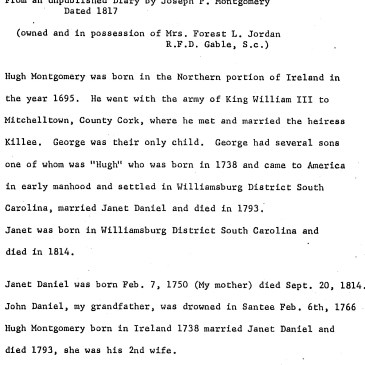 Or, Subtitled, “We have letters from our friends in Ireland, acquainting us of their desire to come here” As the previous posting states, in recent months, I’ve been doing research to assist researchers of American Montgomery families who are combining DNA findings with traditional genealogical research to try to figure out the back-in-time origins of … More Notes about George Montgomery (abt. 1699 – abt. 1758) of Williamsburg, Craven County, South Carolina