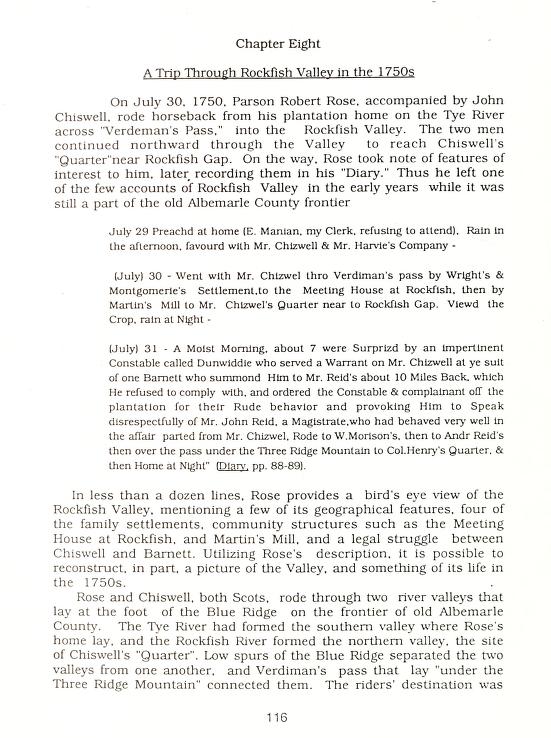 Seaman notes that John Chiswell was seated in Hanover County in the 1740s and took up large land patents in Albemarle including 30,000 acres on the Rockfish by 1739.[8] He then began selling parcels of this land to settlers wanting to farm this land on the western frontier of Virginia by the 1740s.[9]
