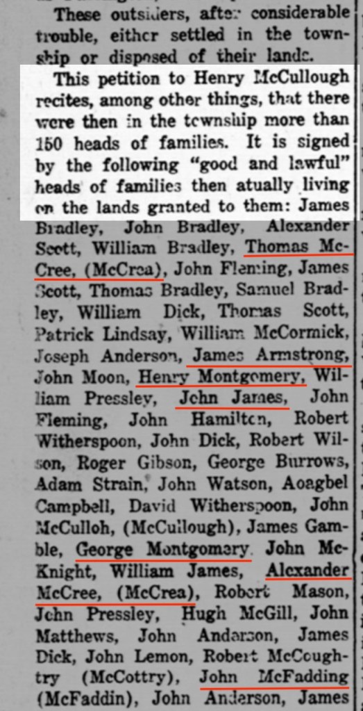 Note Alexander McCrea’s/McCree’s appearance in Henry Montgomery’s will, and also that Henry’s daughter Mary married an Armstrong. And note, in particular, that Henry named a Hugh Montgomery as his nephew. I think in all likelihood this is the Hugh who is said to have been a son of George Montgomery, if Joseph P. Montgomery’s claim that George had a son Hugh is accurate.