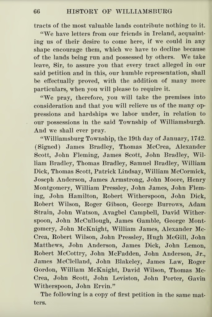 Again, notice the recurrence of Thomas McCree and John McFadden’s names in the inventory and appraisement. Both were signatories of the January 1742 petition. A Thomas McCrea Jr. left a will in Williamsburg naming wife Mary, children Mary Ann, Susannah, and Thomas Armstrong, all with the surname McCrea.[21] Thomas’ executors were his wife Mary, Alexander McCrea, and James McFaddin. The will was witnessed by James McFaddin, Alexander McCrea, and John Scott Jr. The appraisers of Thomas McCrea’s estate were John Scott Jr., James McElveen, and James Montgomery.
