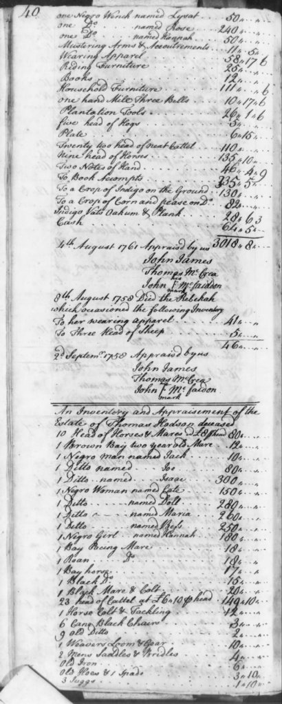7. On 4 August 1761 the estate of George Montgomery was inventoried and appraised by John James, Thomas McCrea/McCree, and John McFaiden/McFadden.[19] Included in the inventory and appraisement is a statement that “the Rebekah” died 8 August 1758, and her inventory, done by the same three appraisers on 28 September 1758, is appended to George’s. George’s estate included seven enslaved persons whose names are given. It includes books, which suggests that George or other family members were likely literate. It also includes mustering arms and accoutrements, suggesting he was likely in a militia and may have been an officer. It also indicates that he grew indigo, corn, and peas (likely field peas).