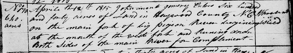 • 12 April 1815: John Montgomery entered 640 acres in Haywood on main fork of Pigeon River for complement.[20]