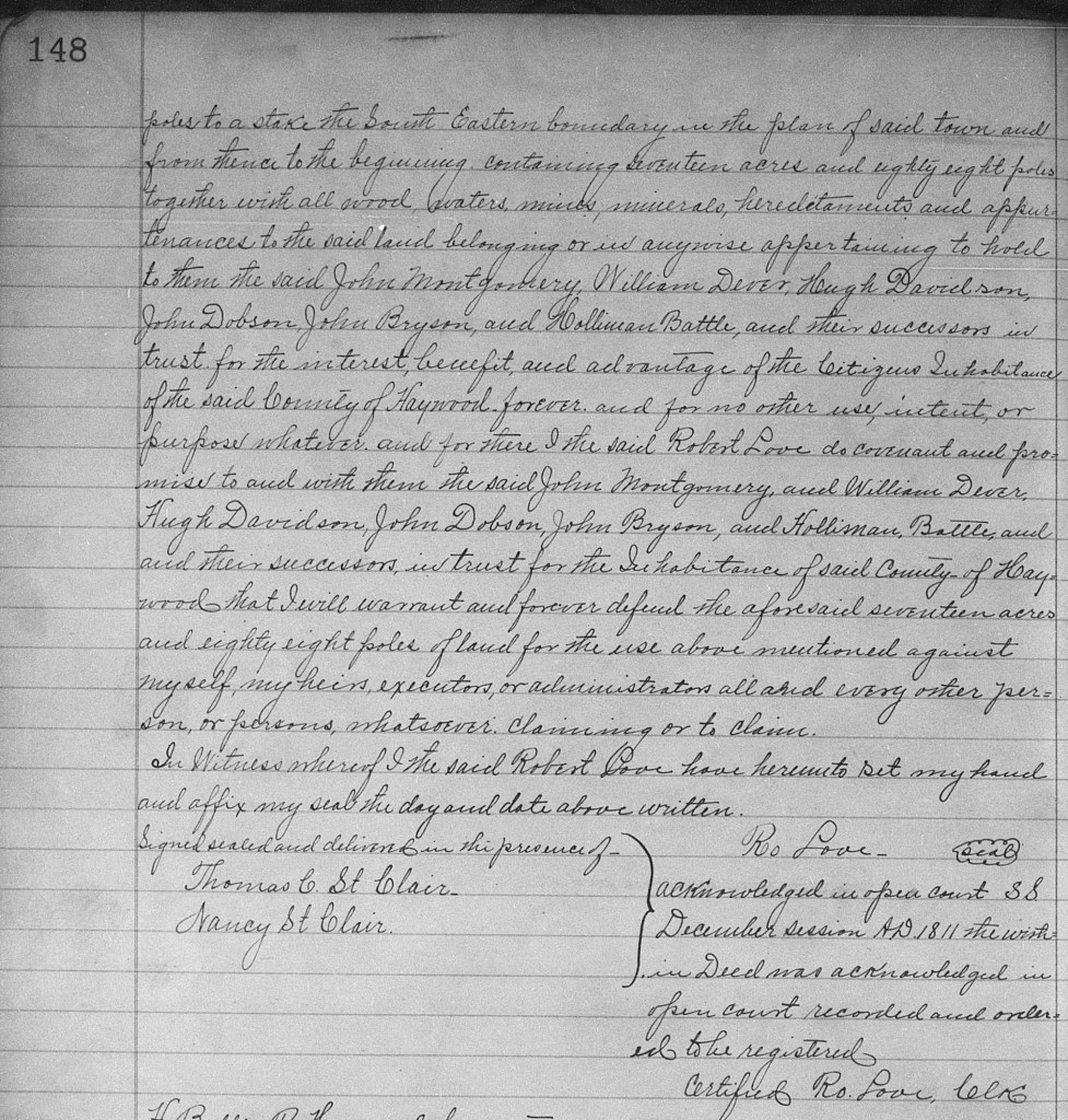 • On 3 November 1809, Robert Love deeded 17 acres of land for the purpose of building a courthouse for the new county, with the recipients of this land deed named as John Montgomery, Hugh Davidson, John Dodson, John Bryson, and Holliman Battle, commissioners appointed to erect the courthouse. The land was on Richland Creek going southwest from Robert Love’s dwelling house. Robert Love signed with witnesses Thomas and Nancy St. Clair, and the deed was acknowledged at court in December 1811 and recorded at the same court session.[14]