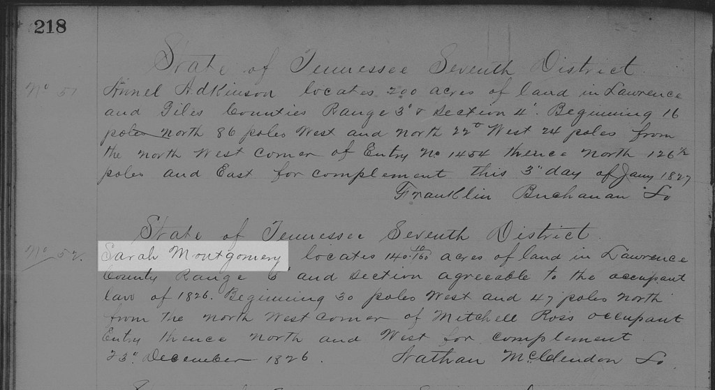 • On 23 December 1826, Sarah Montgomery located 140.10 acres in Lawrence County, range 5 and same section (?) agreeable to occupant laws of 1826. This land bordered Mitchell Ross.[12]