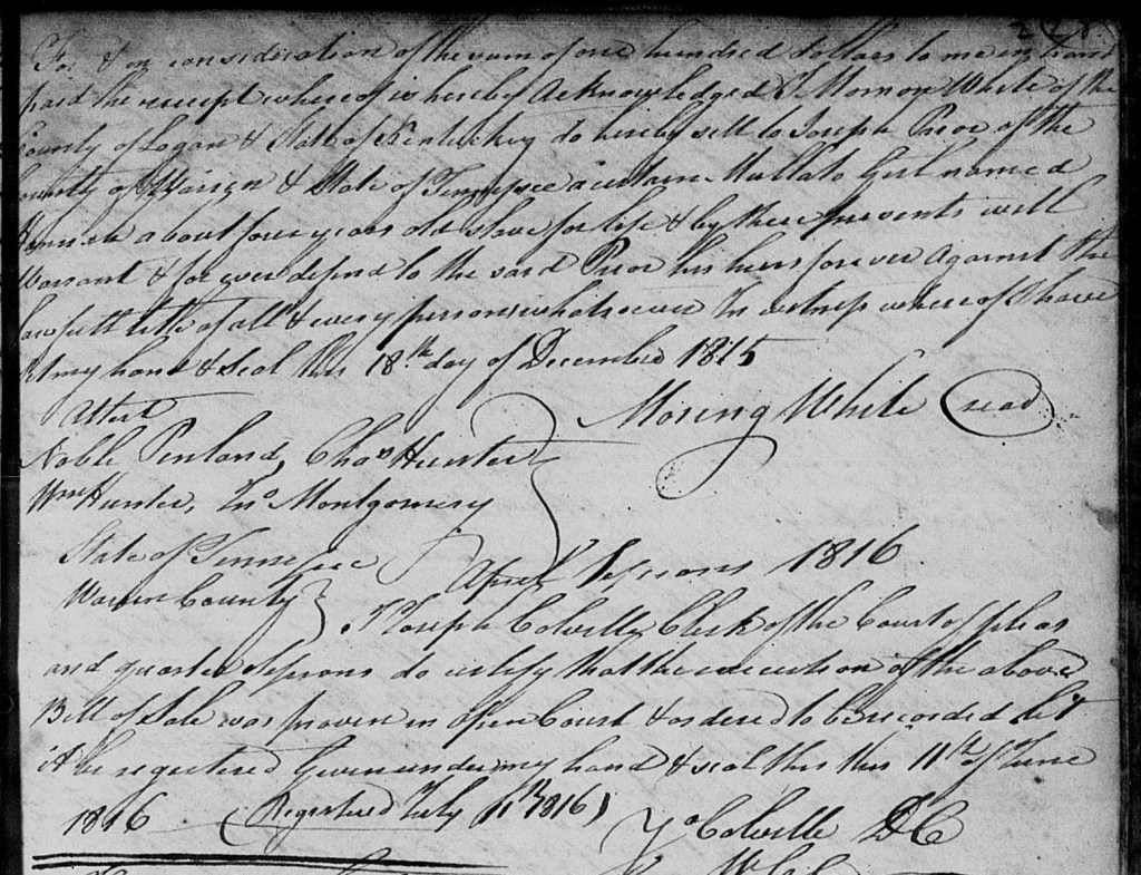 • On 18 December 1815, Joseph Pryor of Warren County, Tennessee, bought an enslaved girl from Mourning White of Logan County, Kentucky, with the bill of sale being made 11 June 1816 and recorded 11 July 1816.