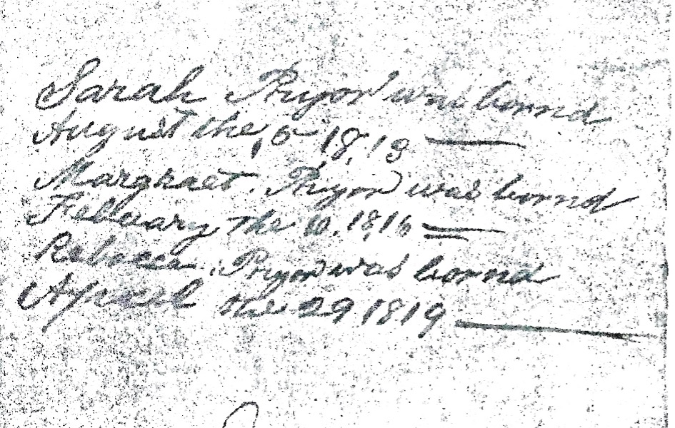 Richard Pryor died intestate, so there’s not a will naming his children. However, a deed made by his heirs following his death captures valuable information about these heirs. On 29 November 1811, the heirs of Richard Pryor deeded to Jonathan Pryor of Logan County for $2,000 a tract of land, 250 acres, on the far fork of Red River in Logan County. This deed was signed by William Pryor, Thomson Pryor, Jeremiah Pryor, Joseph Pryor, James Pryor, Caleb Jobe, Elizabeth Ray, Daniel Jobe, Henry Newby, and William Newby, with James and Jeremiah Pryor witnessing the deed and then proving it on 29 July 1812.[17] The deed explicitly states that those signing it were the heirs of Richard Pryor and were selling land that had come to them as Richard’s heirs. Jonathan Pryor was a son of Richard and Mourning Thomson Pryor; his siblings were selling their brother Johnathan their right to land they had inherited from their Richard Pryor.