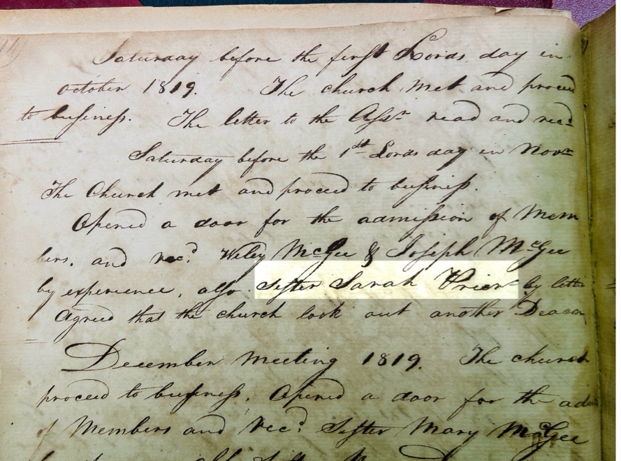 [6] If Joseph Pryor with wife Sarah is a man of this name found in records of Jackson County, Tennessee, records from 1802-1810, then the Sarah Prier (as the surname is spelled here) who was a constituting member of Spring Creek Baptist church in that county on 7 July 1802 may be this Sarah: see C.P. Cawthorn and N.L. Warnell, Pioneer Baptist Church Records of South-Central Kentucky and the Upper Cumberland of Tennessee, 1799-1899 (Cawthorn and Warner, 1985), pp. 514-5. The original name of this church was Blackburns Fork Baptist church. Church minutes show “Sister Pryer” being paid 12 cents on the first Saturday in December 1807 for supplying wine for the Lord’s Supper. On the third Saturday in Oct. 1810, Sarah Pryor received a letter of dismission from the church.