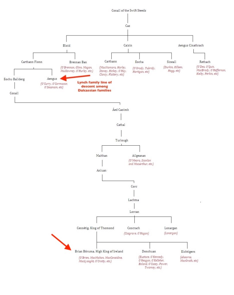 The O’Lynch family derives its origin from Aongus, the second son of Carthan Fionn Oge Mór, who is No. 93 on the “O’Brien Kings of Thomond” pedigree.