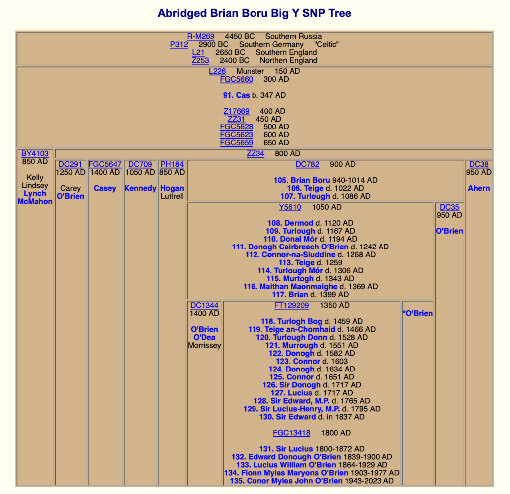 As Peter Biggins notes, the Thomond O’Lynch family is closely related to other families of the kingdom of Thomond long ruled by Brian Boru’s descendants, the O’Briens.[24] These families include the O’Briens themselves, the Kennedys, and the McMahons, all surnames found to be the first matches to the Y-DNA of men descending from Dennis Linchy after our matches to each other have been noted as our strongest matches. Peter Biggins notes that a family with the surname spelling Lindsey (i.e., the family descending from Dennis Linchy) is among the Dalcassian families with historic kinship connections to Brian Boru.[25] Brian’s father was Cennétig mac Lorcáin, the source of the Dalcassian Kennedy surname,[26] and Brian’s brother was Mathgamain mac Cennétig, the source of the Dalcassian Mahon surname.[27]