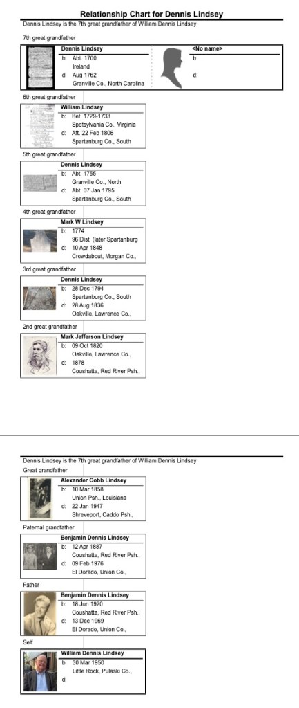As a first-born son, I was given the names William and Dennis after my grandfathers William Z. Simpson and Benjamin Dennis Lindsey. My father was a Benjamin Dennis Jr. My grandfather was named for an uncle Benjamin Dennis Lindsey, who was, in turn named for his grandfathers Benjamin Harrison (1794-1835) and Dennis Lindsey (1794-1836). That Dennis was named for his grandfather Dennis Lindsey (abt. 1755-1795), who was named for his grandfather Dennis Linchy the Irish immigrant.