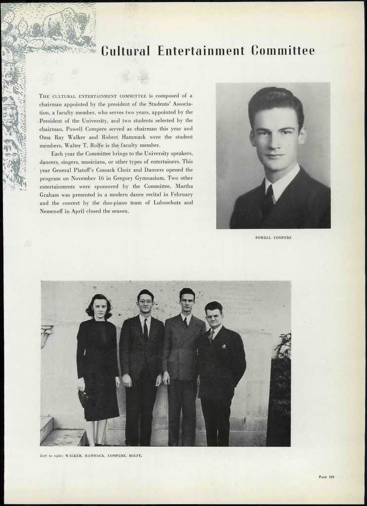 At University of Texas in Austin, where Powell was a pre-law student majoring in economics and political science, he was a Dean’s List honor student, and was actively involved in the cultural and theatrical life of the university. In his second year at UT, the Student Association appointed him chair of the school’s Cultural Entertainment Committee. In his final year there, Powell chaired the building committee for the construction of the school’s first co-op housing, Campus Guild, a project begun in 1937 and completed in 1941.