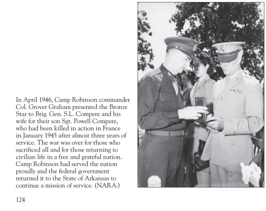 Powell was posthumously awarded a Bronze Star for bravery and a Purple Heart for the sacrifice of his life, with his father General Compere receiving the Bronze Star at Camp Robinson on Powell’s behalf in April 1946.[8]