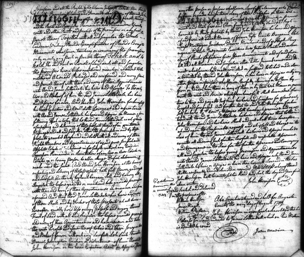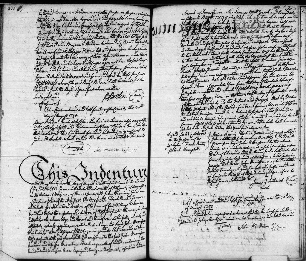 According to Kirk, in 1746, two patents based on previous surveys of Looney’s Mill Creek came into John Harrison’s possession, and three years later, Harrison launched into land speculation by selling 366 acres to James Lauderdale.[18] Kirk indicates that he’s relying here on a deed John Harrison made to James Letherdale in Augusta County in 1749 in which Harrison gave title to 366 acres on Looney’s Mill Creek of the James River to James Letherdale, blacksmith.[19] Kirk gives the deed a 17 May 1749 date, but the deed actually states only the year, though it has a marginal annotation indicating that it was delivered on 4 March 1749 and recorded in August 1749. The deed states that the 366 acres were patented to Harrison on 12 February 1742.