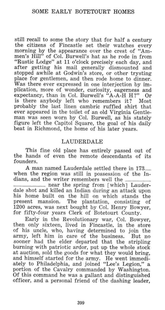 This passage seems to have led some Lauderdale researchers to think that the house named Lauderdale, an historic house at Buchanan in Botetourt County, Virginia, was built by James Lauderdale (abt. 1707? – 1796/7).[28] Wikipedia’s entry entitled “Lauderdale (Buchanan, Virginia)” states, for example, that the Lauderdale mansion was built in 1790 by James Lauderdale Sr. Wikipedia is citing a letter written 12 December 1982 by Gayl Lauderdale Ware of Houston, who purchased the Lauderdale house in 1987 and served as a president of Clan Maitland Society of North America.