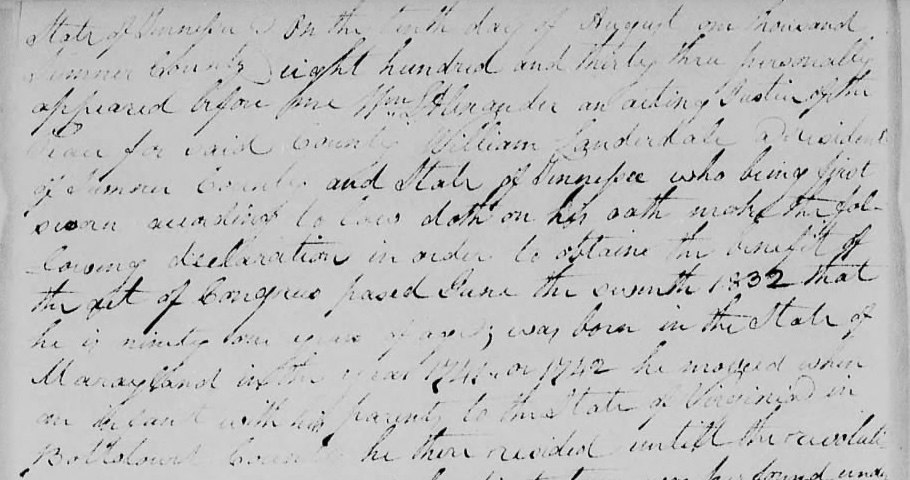 So what can we document regarding the pre-Tennessee history of the James Lauderdale who died in Sumner County, Tennessee, in 1796 or 1797? No extant document that I’ve found gives us a clear indication of his date of birth. We do know from an affidavit James’ son William gave in Sumner County on 10 August 1833 that William was born in Maryland in 1741 or 1742.[6] William is one of the children James Lauderdale names in his September 1796 will in Sumner County, and was made James’ executor along with his brother James. William’s August 1833 pension affidavit states that he was ninety-one years of age and had been born in “the State of Marayland in the year 1741 or 1742,” and that “he moved when an infant with his parents to the State of Virginia in Botetourt County.”