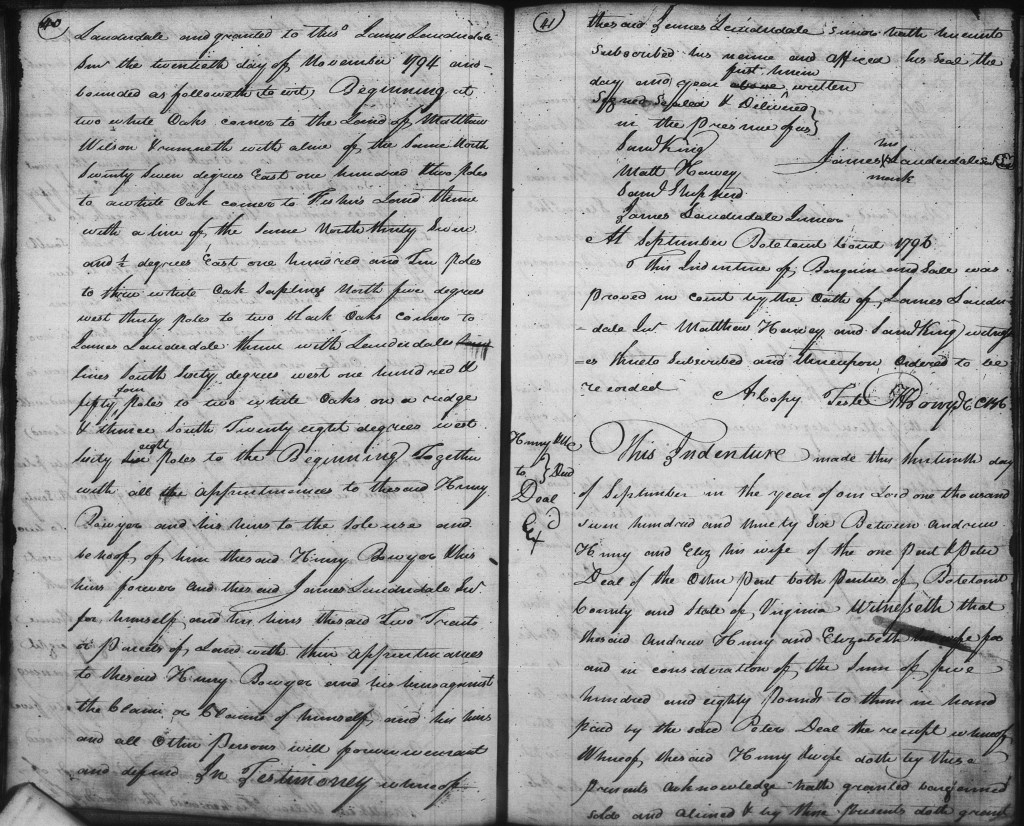 As the preceding posting states, James Lauderdale lived continuously on his 366-acre tract on the James at Looney’s Mill Creek, adding contiguous tracts to it, until he left Botetourt County for Tennessee after making his will in Botetourt County on 22 September 1796.[7] The will states that James was intending to move to Tennessee, when he made the will — most of his children had removed from Virginia to Sumner County, Tennessee — and it’s filed in that Tennessee county, where he died by the first Monday in April when his sons and executors William and James filed an inventory of his estate.[8] Before making his will, on 7 September 1796, James Lauderdale Sr. sold the bulk of his property in Botetourt County, two tracts of land, 444 acres and 55 acres to Colonel Henry Bowyer for £1226 6s, with his youngest son James Jr. witnessing the deed along with several other men, two of them proving it with James Jr. at Botetourt court in September 1796.[9] As with previous documents and his will, James Sr. signed this deed by mark.