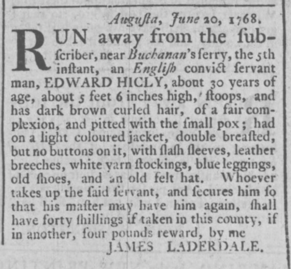 14 July 1768: notice appeared in Virginia Gazette says that Edward Hicly, an English servant aged 30, had run away from James Lauderdale of Augusta (Virginia Gazette, 14 July 1768). James’ surname is given as Laderdale, and the ad was placed 20 June 1768.
