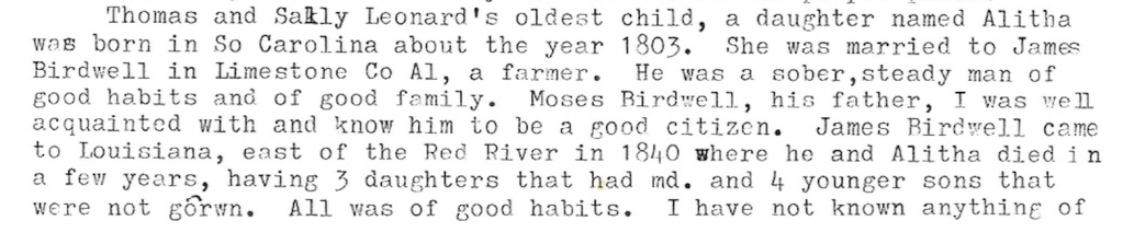 With my last posting about James Lauderdale (abt. 1707 – 1796/7), I’ve drawn to a close, for now at least, my series of postings on my Lauderdale family line. With this posting, I’m inaugurating a new series about another of my ancestral lines, one that ties into the Lauderdale line through the marriage of Thomas Lewis Leonard and Sarah M. Lauderdale. Two charts at my initial posting in my Lauderdale series show my descent from that marriage through Thomas and Sarah’s daughter Aletha R. Leonard (abt. 1803 – abt. 1845), who married James G. Birdwell, son of Moses Birdwell about 1819 in Limestone County, Alabama. (To read the rest of this posting, please click the numeral 2 below.)