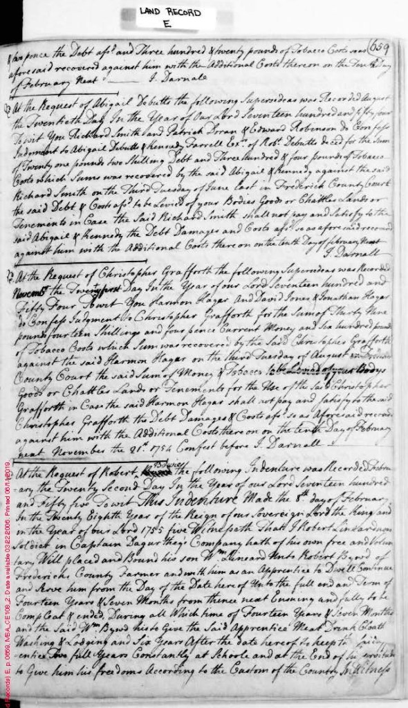 [8] Frederick County, Maryland, Land Record Bk. E, pp. 659-660. The farmer’s name appears in this document as both Robert Bowies and William Byard.