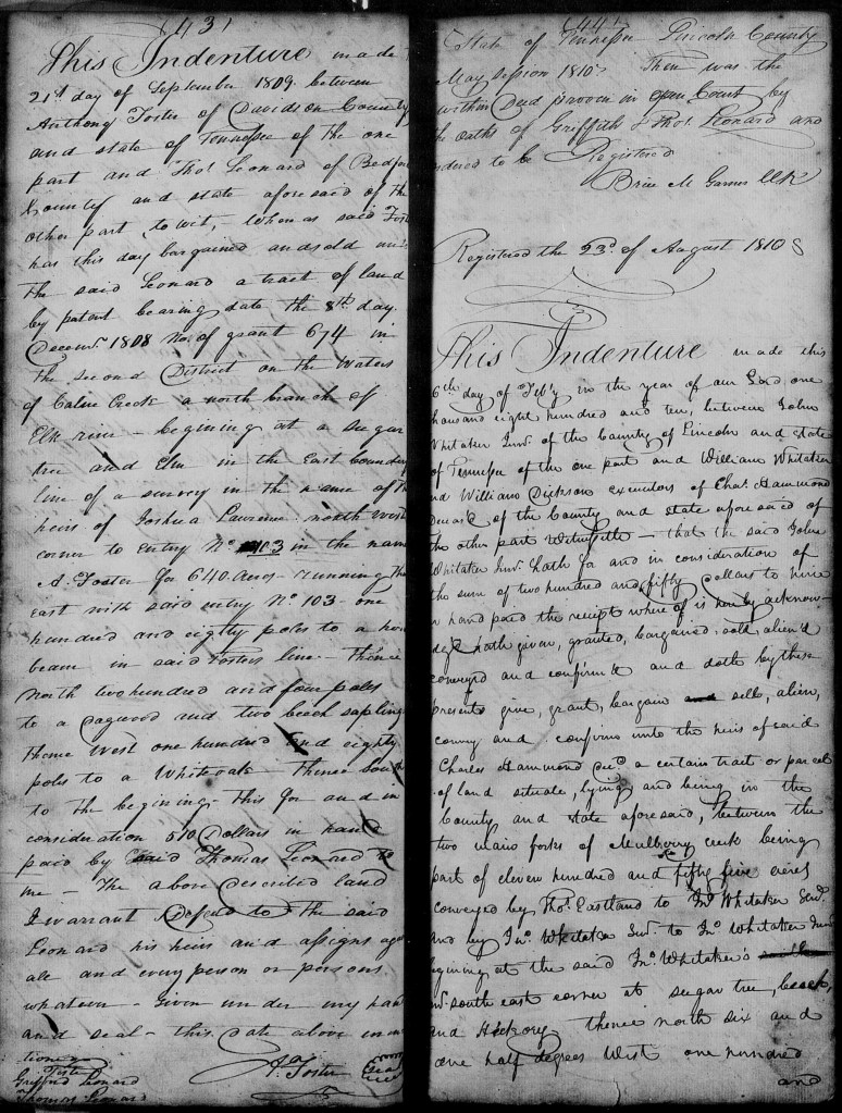 After his move to Limestone County, Alabama, in 1818, Thomas Lewis Leonard made two deeds for land in Lincoln County, Tennessee, to his uncle Colin Campbell in August 1822 that allow us to locate some valuable information about this Thomas in Lincoln County records before he left Tennessee for Alabama. This information is all the more helpful when many Lincoln County documents in the period 1808-1818 do not use the Sr. or Jr. designation for the two Thomas Leonards who were of age in those years.