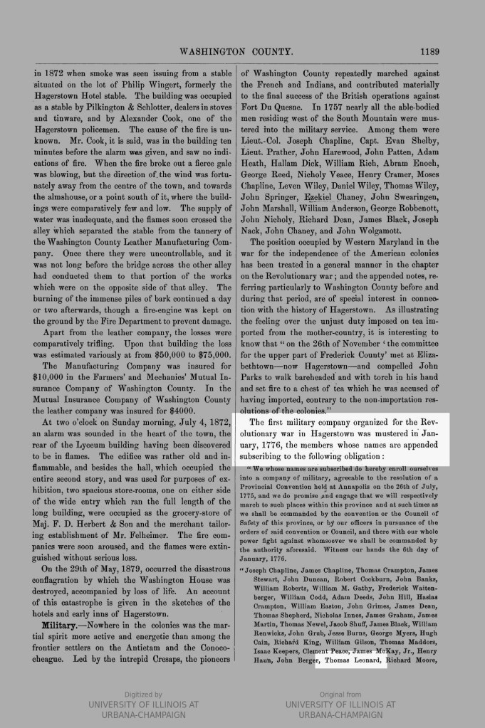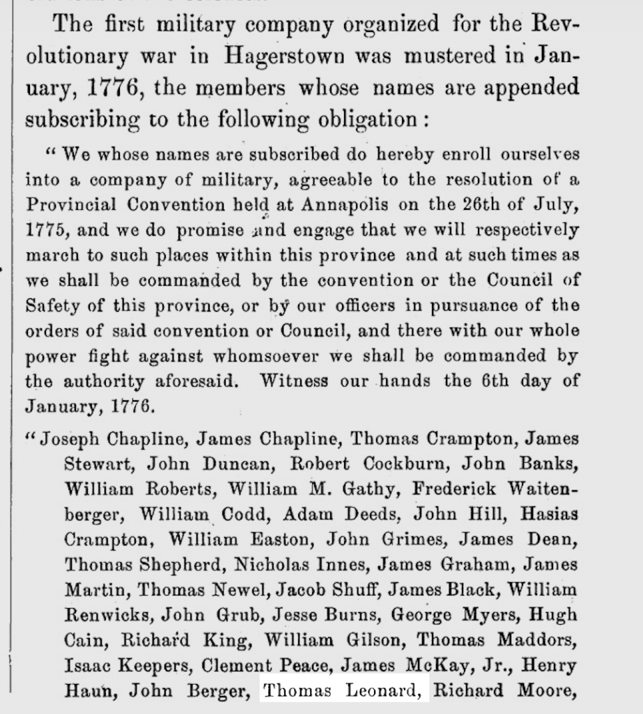 A January 1776 record definitely places Thomas Leonard in the part of Frederick County, Maryland, that would become Washington County in September 1776: as Thomas J. Scharf states,[3]
