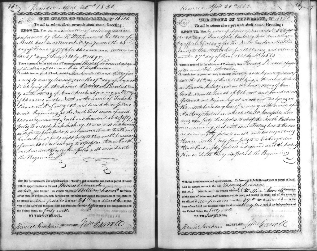 [27] Tennessee Land Grant Bk. S, pp. 868-9, grants 16803 and 16820.