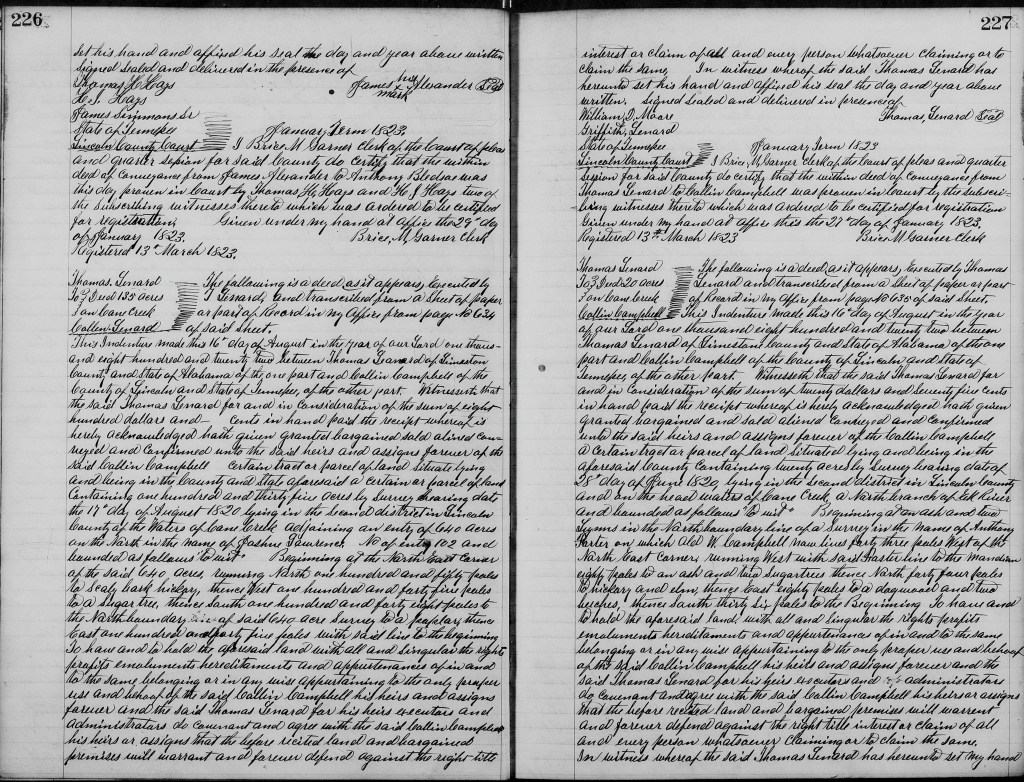 On 16 August 1822, Thomas Leonard made two deeds to Colin Campbell for tracts of 135 acres and 20 acres in Lincoln County, Tennessee.[26] The two deeds recording this land sale both state that Thomas Leonard was living in Limestone County, Alabama, when he sold the land. So this tells us that the Thomas deeding the land was Thomas Lewis Leonard and not his father Thomas Leonard. Both pieces of land were on the headwaters of Cane Creek. These deeds were witnessed by Thomas Lewis Leonard’s brother Griffith James Moore and brother-in-law William Depriest Moore, husband of Thomas and Griffith’s sister Hannah Leonard.