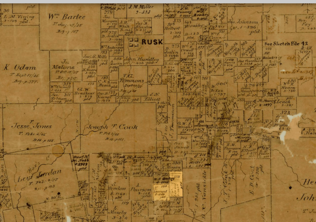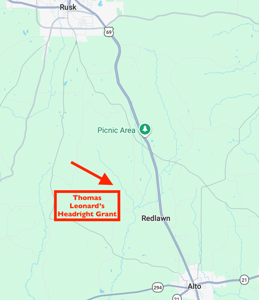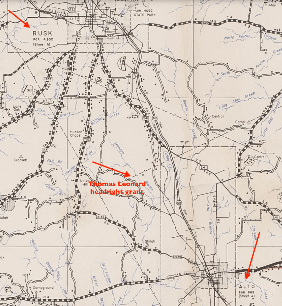 As my first posting in this series about Thomas Lewis Leonard notes, the 1883 document entitled “Biography of the Leonards” composed by Thomas’ cousin Thomas Dunlap Leonard states that when Thomas and Sarah Lauderdale Leonard moved to Texas, they settled “near Alto where he opened a good farm.” Alto is a small town of some thousand residents about twelve miles southeast of the county seat, Rusk. It was laid out in 1849 on a drainage divide between the Angelina and Neches Rivers — hence its name meaning “high” in Spanish.