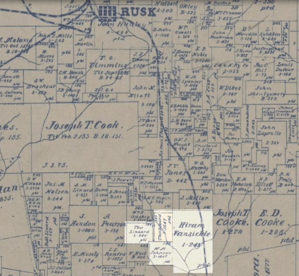 A number of maps of Cherokee County allow us to pinpoint precisely where Thomas’ two headright grants of 320 acres were located. Joseph Martin’s 1851 map of Cherokee County and a 1902 plat map of the county, both drawn for the General Land Office of Texas, show Thomas Linard with two tracts of 320 acres contiguous to each other, bordering Hiram Vansickle’s 1,467-acre survey to the west and bordered on the south by a headright grant tract belonging to Thomas’ son-in-law William Marmaduke Johnston.[5] The shape of the two tracts matches the plats for each 320-acre tract drawn on the surveys found in the GLO files for these two headright grants.
