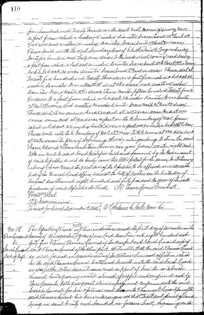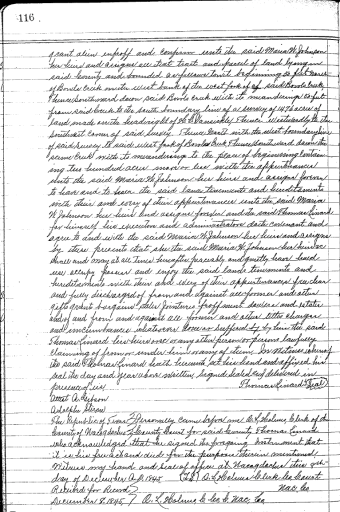 The deed for love and affection to wife Sarah states that Thomas was giving Sarah 538 acres bordering Hiram Vansickle’s survey (the land was actually a portion of 1,476 acres surveyed for Vansickle) and with Bowles Creek running through the land. Sarah was to have unhindered ownership and use of the property with its appurtenances. Thomas signed as Thomas Linard, and A. Gibson and Adolphus Sterne witnessed the deed. On 8 December, Thomas acknowledged the deed and it was recorded.