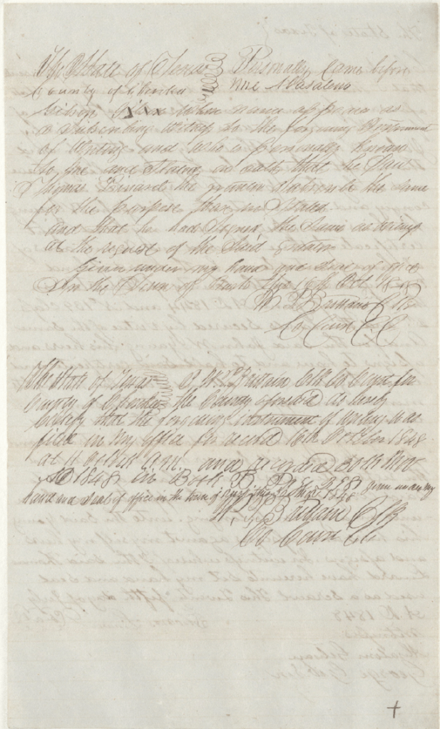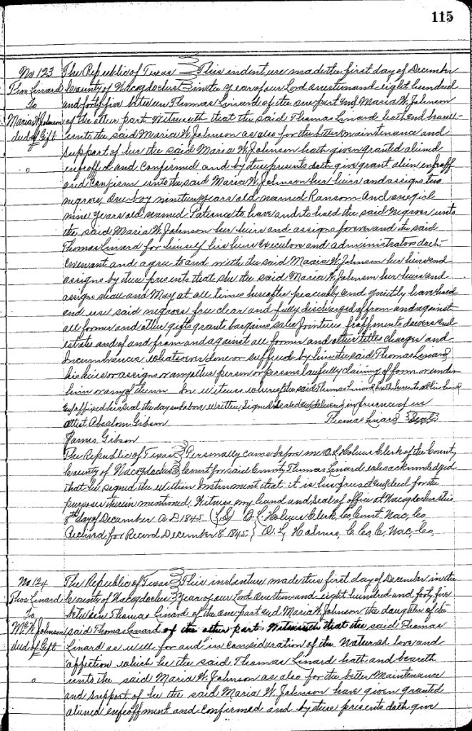 [9] My notes for the deed to Marmaduke Johnston, which came to me from Nancy Breidenthal, say that this deed is filed in Cherokee County, Texas, Deed Bk. G, p. 58. The deeds of gift to Thomas’ wife Sarah and daughter Maria Johnston are in Nacogdoches County, Texas, Deed Bk. G, pp. 110-1, 115-6. I do not have a copy of the deed to Marmaduke Johnston and know no details about it. Because records for both Nacogdoches and Cherokee Counties are locked at the FamilySearch site, I cannot consult the original records. I do have photocopies of the deeds of gift to Sarah Linard and Maria Johnston. If it’s correct that the deed to Marmaduke Johnston is in Cherokee County Deed Bk. G while the two deeds of gift are in Nacogdoches County Deed Bk. G, I cannot account for the fact that these instruments are filed in two different counties, especially when one notes that Cherokee County was separated from Nacogdoches in July 1845, and this land (and the enslaved people named in the deed of gift to Maria) were in Cherokee County.