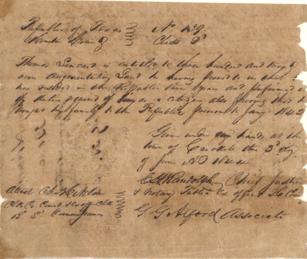 [3] See Texas General Land Office land grant file 660, patent volume 5, patent number 496, certificate 139, available digitally at the website of Texas GLO. See also Nacogdoches County, Texas, Board of Land Commissioners Records, files 23, 24C.