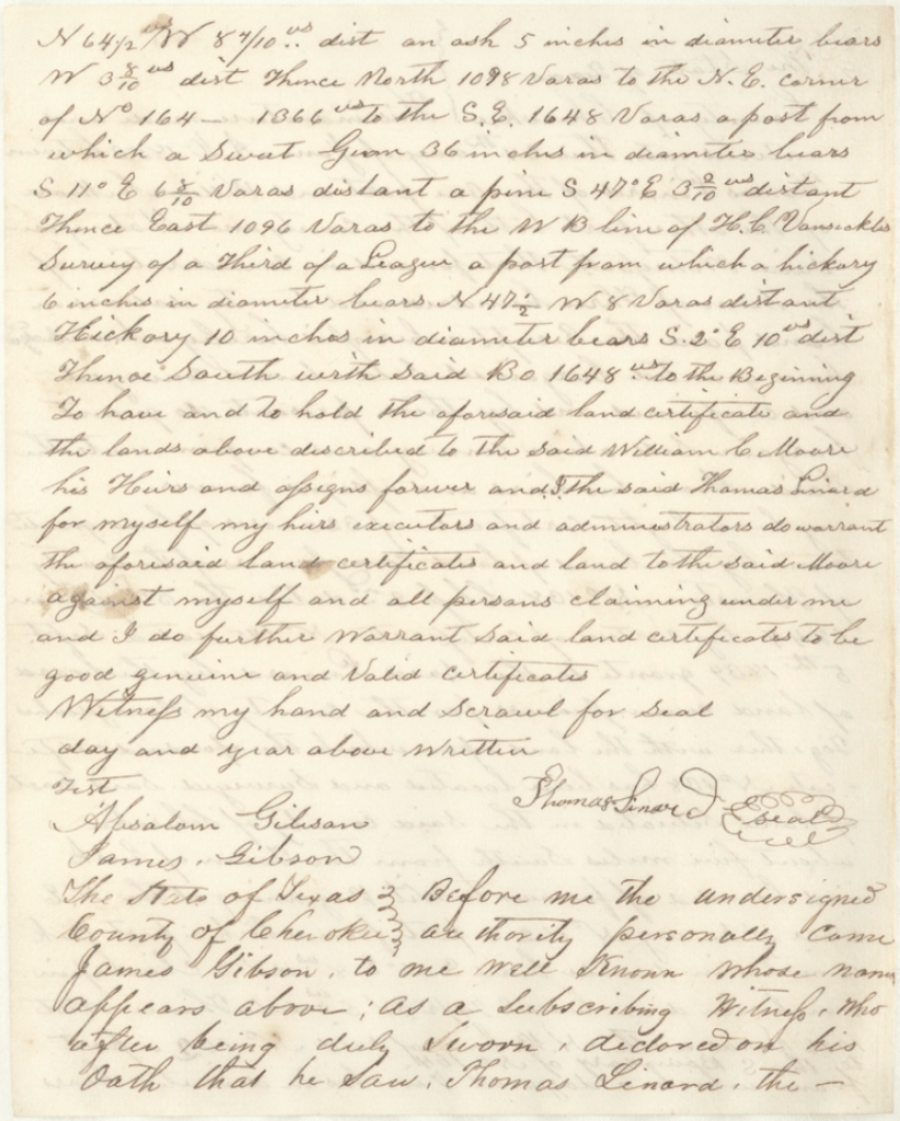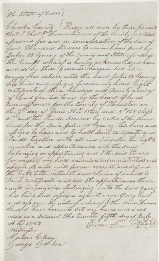 On 25 July 1848, Thomas Leonard sold one of his two headright grants, the tract he had been granted by certificate no. 139.[13] He sold this land for $400 to John W. Young, with Absalom and George Gibson witnessing as he signed the deed. Absalom Gibson proved the deed on 16 October 1848 and it was recorded on 30 November. The original deed is filed with the Texas GLO for this tract of land.[14]