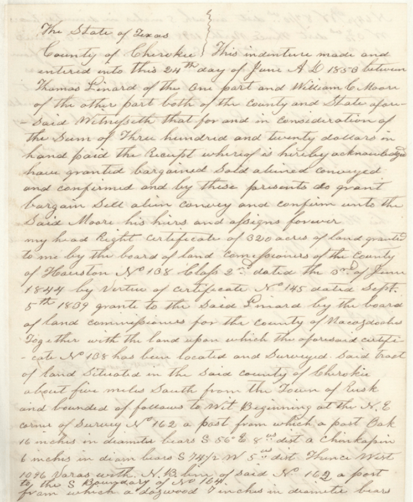 [18] Cherokee County, Texas, Deed Bk. H, pp. 322-3. The original deed is in the Texas GLO file for this tract of land, certificate no. 139: see supra, n. 2. On William C. Moore, see Mrs. James E. Bishop, “William C. Moore and Elizabeth Younge Moore,” in Cherokee County History, p. 419.
